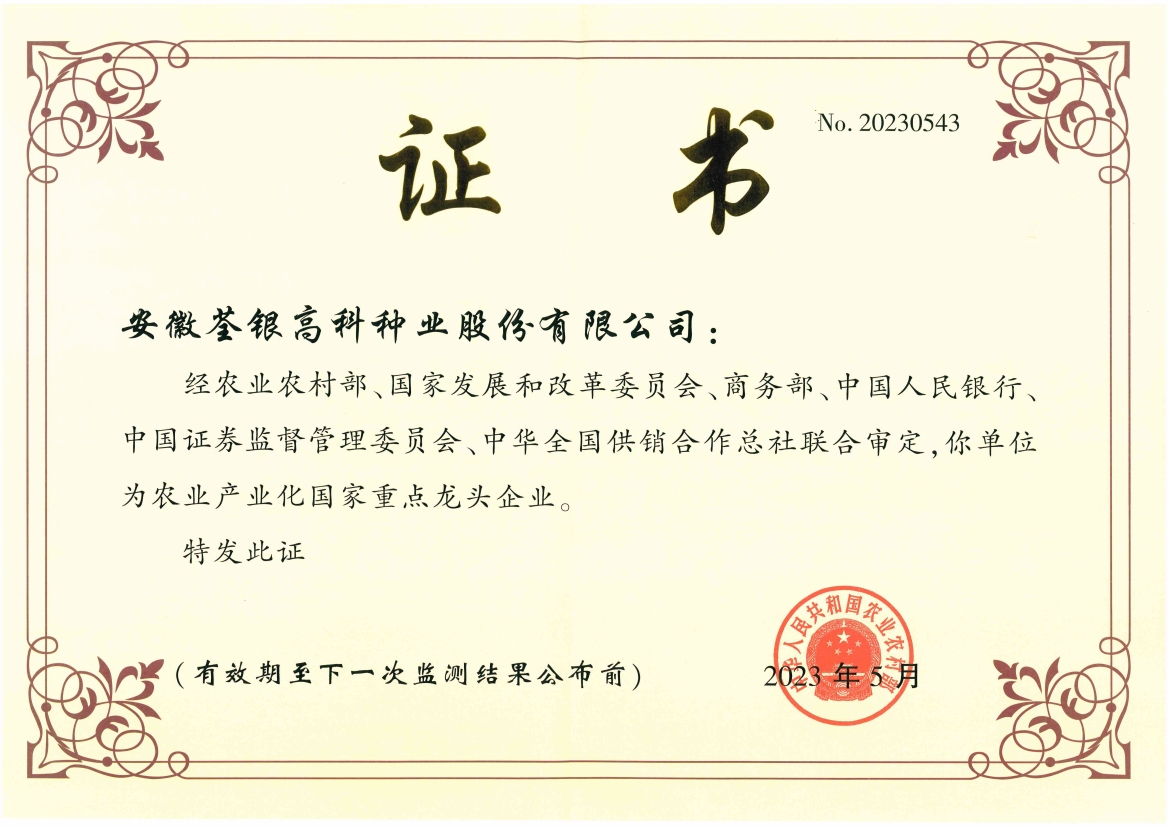 安徽荃銀高科種業股份有限公司是一家“以種業為核心、農業服務為延伸、探索和創新農業多元化發展”的現代高科技種業上市公司,證券代碼:300087。公司注冊資金9.47億元,系“中國種業領軍企業、農業產業化國家重點龍頭企業、國家高新技術企業、農業部首批農作物種子育繁推一體化企業、中國種業信用明星企業"。在國內控股子公司20多家,在國外設立分支機構4家,良種銷售至全國20多個?。ㄊ?、區),出口覆蓋20多個國家與地區,種業綜合實力、雜交水稻研發、推廣及海外業務規模均居全國種子企業前2位。
